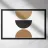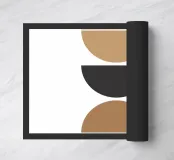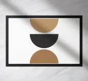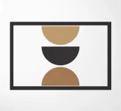 Due serie di semicerchi sono impilati verticalmente, ciascuno con colori contrastanti come l'arancione, il beige e il nero, creando motivi geometrici. La simmetria e il contrasto cromatico evocano un senso di equilibrio e di design moderno.
