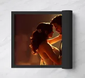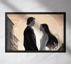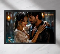 Coppia sensuale abbracciata in una luce dorata Questa immagine cattura una coppia in una danza tenera e intima, circondata da un'illuminazione calda e dorata e da colori tenui, che evocano le atmosfere lunatiche dei classici film noir e i ritratti psicologici e ricchi di sfumature di Lucian Freud.