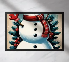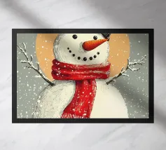 Il pupazzo di neve, completo di sorriso amichevole, naso a carota e braccia a ramoscello, aggiunge un tocco di allegria a una serena atmosfera invernale, perfetta per le decorazioni stagionali.