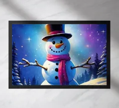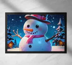 Un pupazzo di neve, con tanto di cappello a cilindro e sciarpa, saluta la sera d'inverno in una foresta serena. I fiocchi di neve cadono delicatamente intorno, creando un'atmosfera magica.