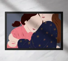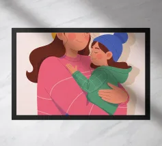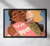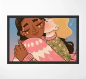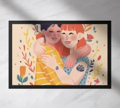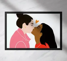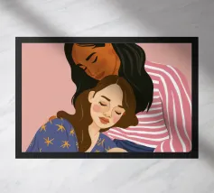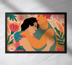 Questa opera d'arte mostra due persone che si abbracciano, con uno sfondo rosa e il simbolo di un cuore sopra di loro. I colori caldi e la posa affettuosa trasmettono un senso di amore e calore.