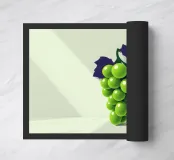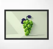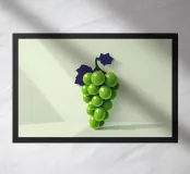 Un grappolo d'uva di un verde intenso poggia su uno sfondo chiaro, illuminato da una luce delicata che ne mette in risalto la consistenza lucida e le ombre sottili.