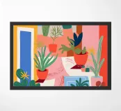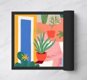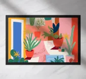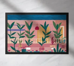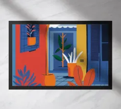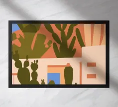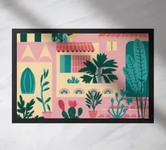 Questo disegno porta in casa vostra la gioia di vivere mediterranea e la leggerezza estiva. L'illustrazione colorata mostra un vivace patio pieno di piante fiorite e cactus in vasi eleganti, circondati da colori caldi e terrosi. L'aspetto moderno e disegnato a mano e l'armoniosa composizione cromatica di rosa, giallo, blu e verde rendono il motivo un richiamo visivo ideale per murales, tazze, cuscini e molto altro. Perfetto per gli amanti delle piante che desiderano portare la natura e il colore nei loro spazi abitativi. Un'attrazione per ogni casa o un regalo creativo.