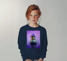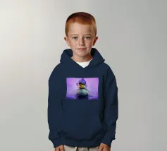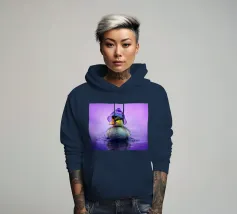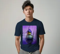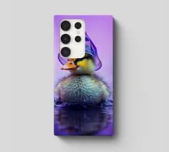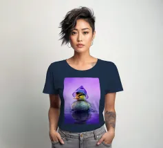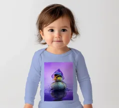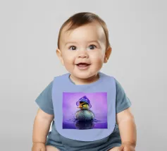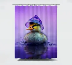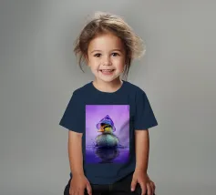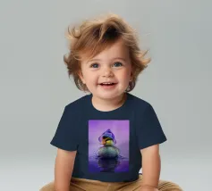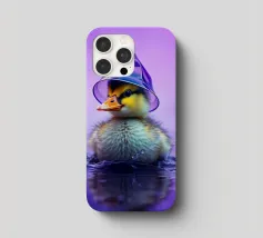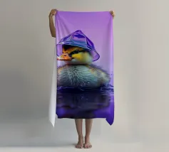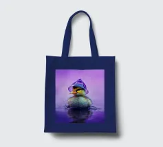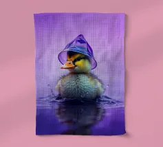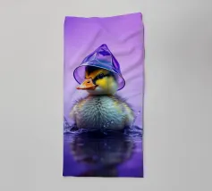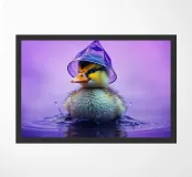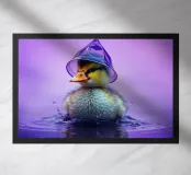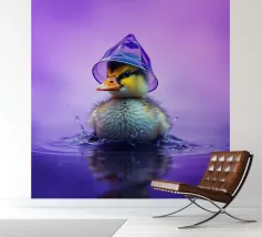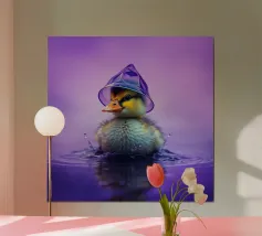 Un piccolo anatroccolo nuota giocosamente nell'acqua calma, indossando un vivace cappello viola. Lo sfondo è morbido e sognante, creando un'atmosfera stravagante intorno all'allegra scena.