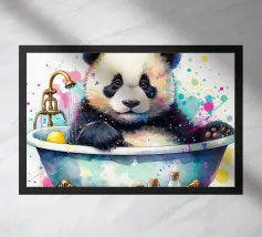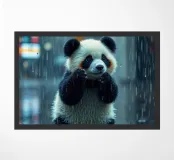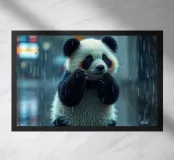 Un piccolo panda sta giocando in una pozzanghera, circondato da acqua piovana scintillante. Lo sfondo mostra luci colorate e una vibrante atmosfera cittadina in una giornata di pioggia.