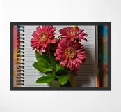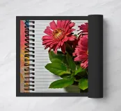 Un taccuino rilegato a spirale presenta tre fiori rosa e foglie verdi, disposti su una superficie di legno colorato, che invitano alla creatività e all'ispirazione.