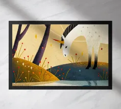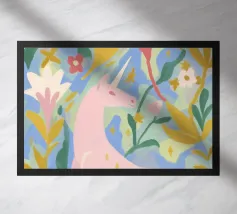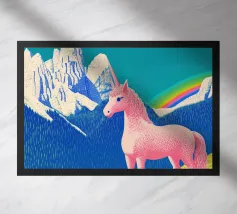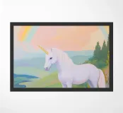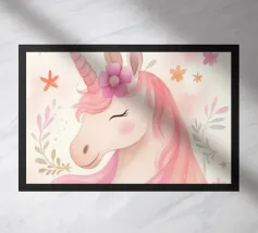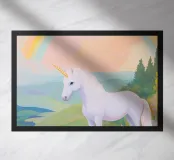 Un dolce unicorno in piedi davanti a dolci colline e a un luminoso cielo arcobaleno: questo disegno cattura il fascino della fantasia e la meraviglia dell'infanzia. Perfetto per le camerette, le stanze dei giochi o per chiunque ami la tranquilla magia dei paesaggi mitici.