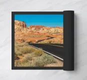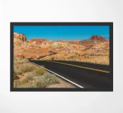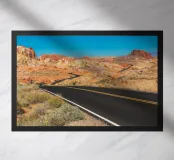 Un'autostrada nera che si snoda attraverso i deserti della Valle del Fuoco, in Nevada.