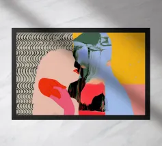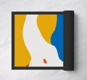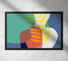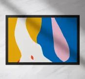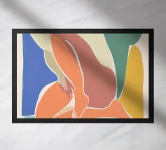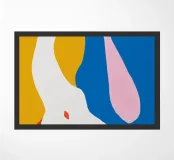 Forme astratte e audaci in colori vivaci creano una composizione giocosa e dinamica. Le forme sovrapposte e la varietà di colori suggeriscono un senso di movimento e fluidità.