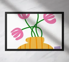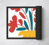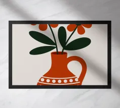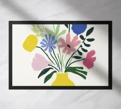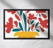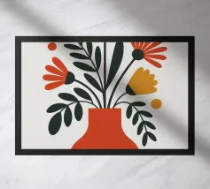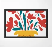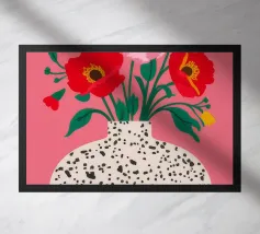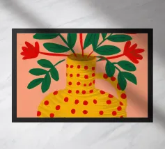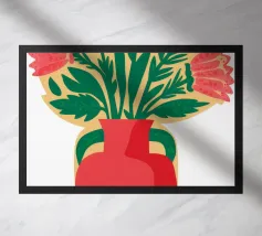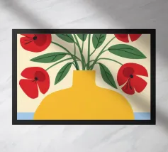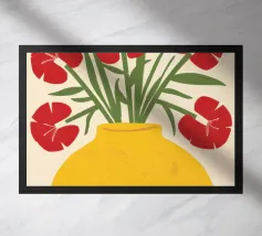 Un vaso giallo in stile vimini contiene un semplice e bellissimo bouquet di fiori rossi, creando una natura morta solare e strutturata.