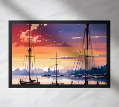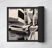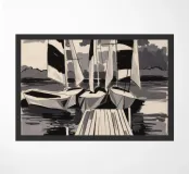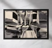 Striped sailboats docked at a pier in high contrast black and white, evoking bold graphic strength.