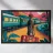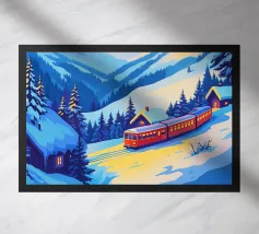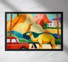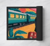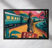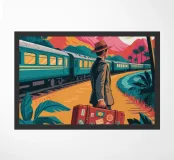 L'opera raffigura una persona in piedi vicino a un treno con una valigia, sullo sfondo di montagne e palme. La scena evoca un senso di nostalgia e avventura.