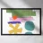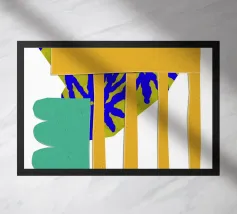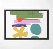 Una composizione vivace presenta varie forme geometriche in colori contrastanti, tra cui una griglia verde, rettangoli viola e rosa e cerchi blu. La composizione presenta forme astratte e giocose, come un asterisco giallo e una linea blu frastagliata, su uno sfondo bianco.