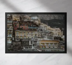 Vista su Positano. Positano nella splendida Costiera Amalfitana. Fotografia di strada e architettura in Italia. Fotografia in bianco e nero.