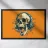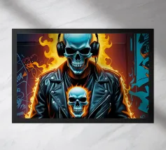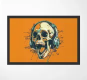 Illustrazione digitale dettagliata di un teschio umano che indossa grandi cuffie, su uno sfondo arancione vivo con effetti splatter. Il teschio sembra apprezzare la musica, aggiungendo un'atmosfera moderna e tagliente al design.