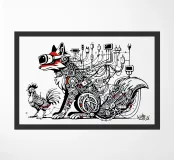VR Fox and its hen, Graffiti style, urban style, wall art, nature, organic and electronical/mechanical. From original hand-painted unique design by the french artist Shag based in Annecy, France. Originally painted with acrylic on a woodboard.