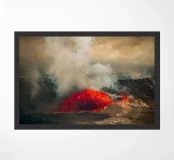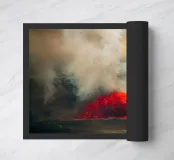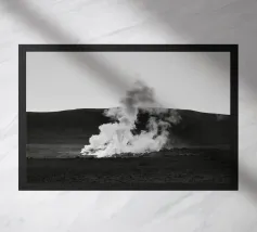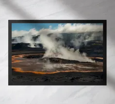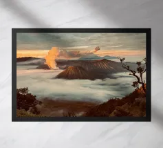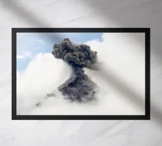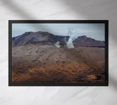 Un vulcano torreggiante si staglia contro il cielo, con le sue pendici scure striate da vecchie colate di lava. Densi pennacchi di fumo salgono dal cratere, si disperdono nell'aria e dipingono l'orizzonte con sfumature di grigio. L'atmosfera è tesa e viva, come se la terra stessa respirasse.