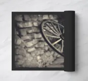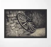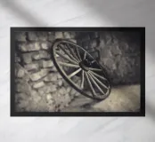 Un'inquadratura a fuoco ridotto di una vecchia ruota di legno a raggi di un carro in un fienile di pietra in Francia.