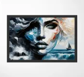 Painting of a woman at sea with a sailing boat in the background.