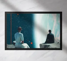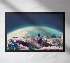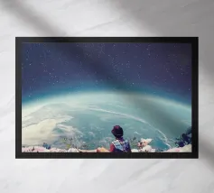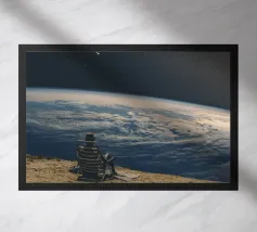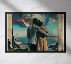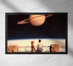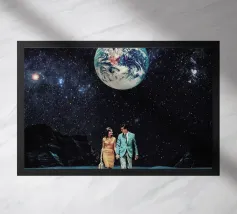 Vivevamo lì. Ricordate? Quel mondo ci sta ancora aspettando. ~ Coppia seduta su una panchina che guarda la Terra surreale retro futuristico stellato composizione romantica. versione orizzontale