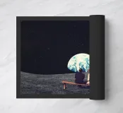 Vivevamo lì. Ricordate? Quel mondo ci sta ancora aspettando. ~ Coppia seduta su una panchina che guarda la Terra surreale retro futuristico stellato composizione romantica. versione orizzontale