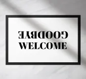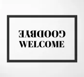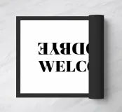 Un gioco minimalista con la prospettiva e il significato: in alto c'è la parola "GOODBYE", ma capovolta, come se stesse solo dicendo addio. Sotto: "WELCOME", chiara e verticale, pronta per il passo successivo. La tipografia è audace, diretta e in nero: una dichiarazione in due parole che mette visivamente in scena la transizione tra l'arrivo e la partenza. Questo design è perfetto per le aree di ingresso, dove umorismo e stile vanno di pari passo. Parla direttamente agli ospiti, con un ammiccamento e un tocco di intelligenza progettuale.