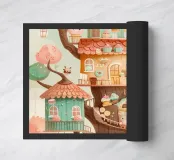 Una magica illustrazione verticale di un'accogliente pasticceria sull'albero immersa tra alberi color pastello. Ogni livello è popolato da affascinanti personaggi animali che preparano cupcake, impilano pasticcini e sorseggiano cioccolata. Con i suoi tetti di pan di zenzero, i dettagli giocosi e la calda tavolozza di toni menta, fard e miele, questa scena sembra un dolce sogno. Perfetto per le camere dei bambini, le pareti delle camerette o per chiunque ami un tocco di fantasia commestibile e di dolcezza.