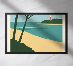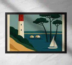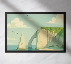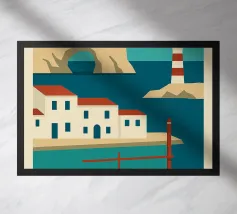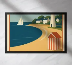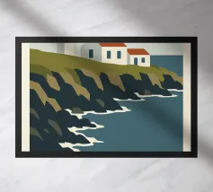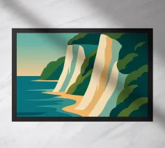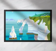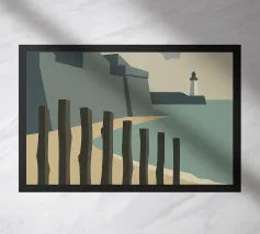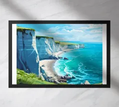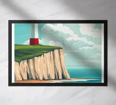 Design di viaggio minimalista dell'Inghilterra meridionale con le famose scogliere bianche (chalk cliffs) e il faro sulla costa inglese vicino a Dover. Tipico paesaggio di scogliere chiare.