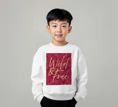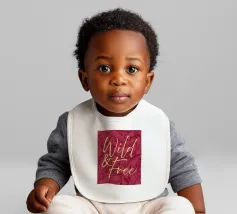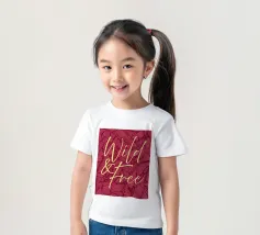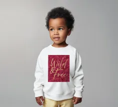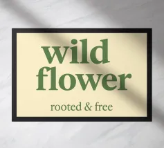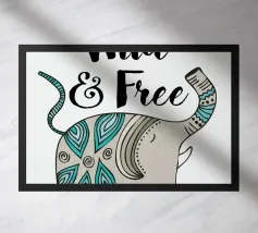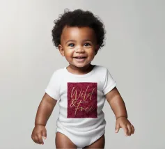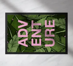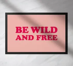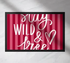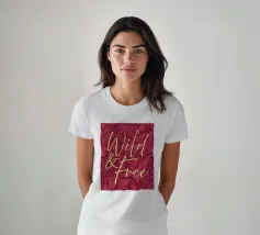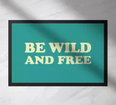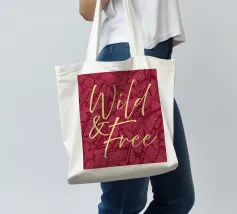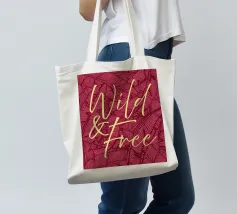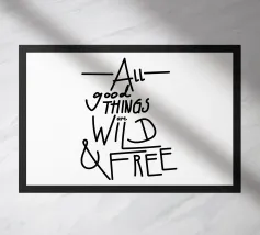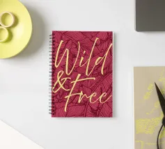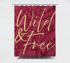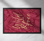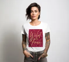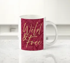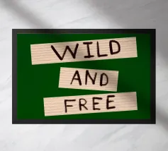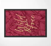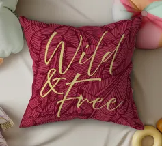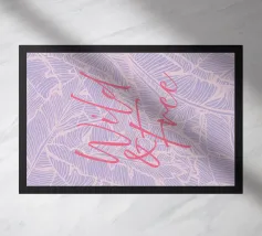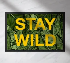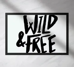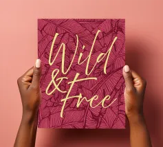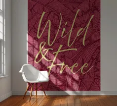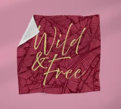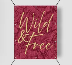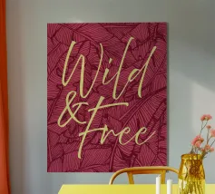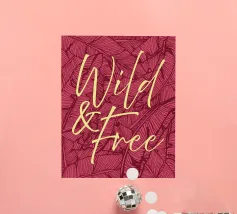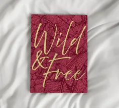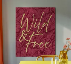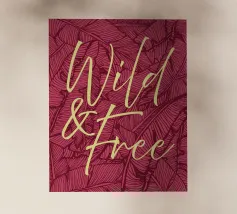 Citazione scritta a mano semplicemente "Wild & Free" su sfondo in grassetto di foglie tropicali.