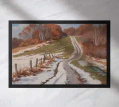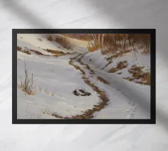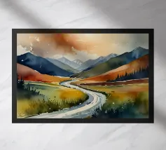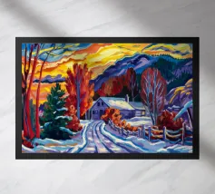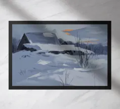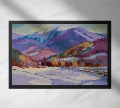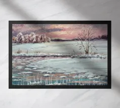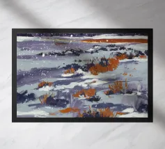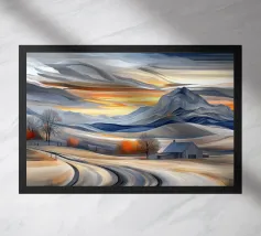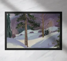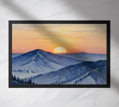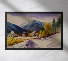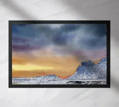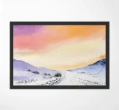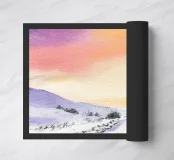 Paesaggio invernale acquerellato al tramonto in arancione, rosa e viola