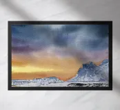 Paesaggio invernale ad acquerello di montagne nella luce serale con cielo e tramonto drammatici