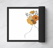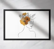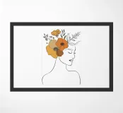 Un disegno al tratto minimalista raffigura il profilo di una donna dall'espressione serena. I suoi capelli sono ornati da grandi fiori stilizzati di colore arancione e giallo e da foglie delicate.