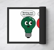 Due lampadine dei cartoni animati, una verde e una rossa, si confrontano in una conversazione scherzosa sul lavoro durante le vacanze. La lampadina verde pone la domanda, mentre la lampadina rossa risponde con umorismo.