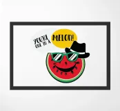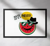 Il personaggio di un'anguria fresca indossa occhiali da sole e un cappello mentre pronuncia un gioco di parole con il testo "Sei un melone!" in bolle vocali.
