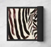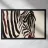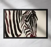 A simple portrait of a zebra, with bold stripes painted in soft, earthy tones