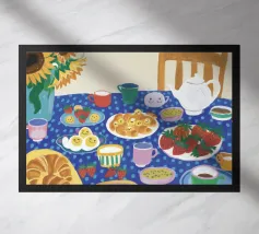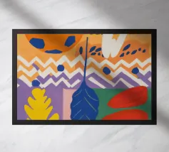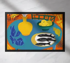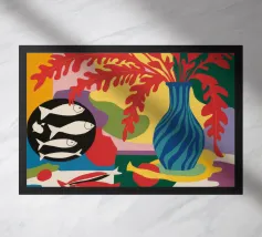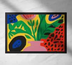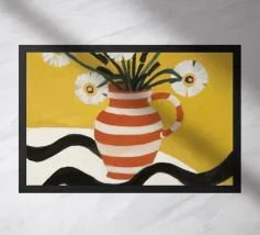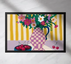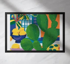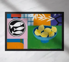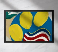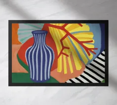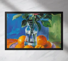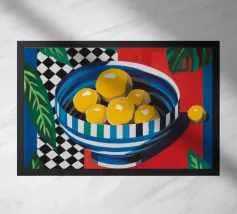 Un vivace bouquet di fiori e agrumi si trova in un vaso blu su un tavolo rosa. Lo sfondo è un mix dinamico di motivi a zig zag in bianco e nero e foglie verdi, che creano una natura morta moderna e giocosa.