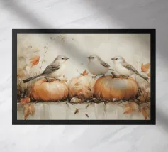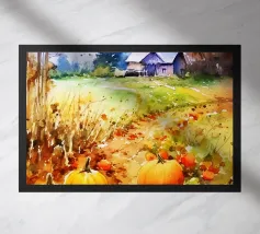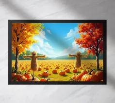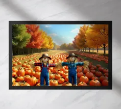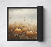 Zucche vivaci sparse in un campo erboso sotto un cielo nuvoloso, con alti fiori bianchi sullo sfondo. Cattura l'essenza dell'autunno.