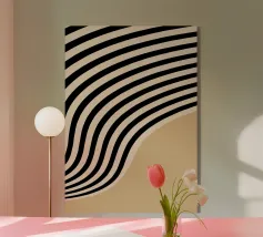 Een harmonieus golfpatroon in zwart op een crèmekleurige achtergrond die de minimalistische boho-stijl perfect weergeeft. Dit ontwerp wordt gekenmerkt door zachte, vloeiende lijnen die rust en evenwicht uitstralen. Als muurschildering, kussen, mok of hoesje voor je mobiele telefoon - dit abstracte kunstwerk brengt elegantie en moderniteit in elke kamer. Ideaal voor designliefhebbers die op zoek zijn naar stijlvolle accenten en een geweldig cadeau voor creatieve geesten.