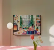 Een charmant digitaal abstract schilderij met een hoge resolutie dat een intieme interieurscène vastlegt die perfect is voor een gezellige middag. Een figuur met een vlecht zit genesteld op een levendige, gestreepte poef en leest een boek bij een groot raam dat een besneeuwd, geabstraheerd bos omlijst. De kamer is een feest van textuur en kleur, met een rustieke open haard die gloeit in warme tinten, ingebouwde boekenplanken en muren versierd met een scala aan Maximalistische stippen en abstracte kleurblokken. De hele scène is weergegeven in een expressieve, schilderachtige stijl die warmte en Hygge-comfort oproept. Dit hoogwaardige digitale bestand is pro