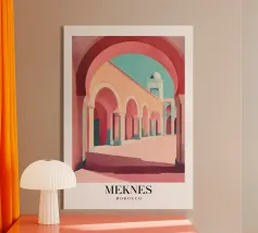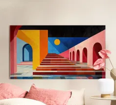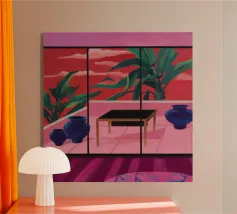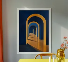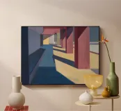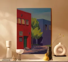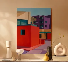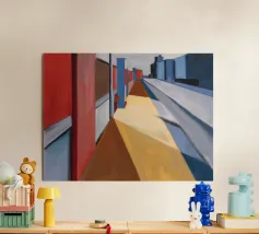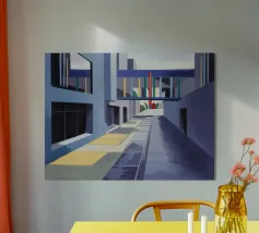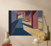 De grimmige geometrie van een overdekte wandelgang wordt gedefinieerd door krachtige karmozijnrode pilaren en de lange, scherpe schaduwen die ze werpen in het felle zonlicht. Dit schilderij is een krachtige studie van licht, schaduw, kleur en architectonische vorm.