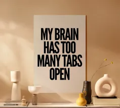 Breng wat humor in je huis of op je werkplek met deze geestige print, met de zin "My Brain Has Too Many Tabs Open" in vette, gestapelde hoofdletters. De moderne zwarte typografie knalt tegen een warme grijze achtergrond, waardoor het een perfecte conversatiestarter is. Ideaal om cadeau te doen aan vrienden, collega's of studenten die houden van een speelse kijk op de dagelijkse chaos. Deze print geeft een stijlvol, herkenbaar tintje aan elk interieur en is geweldig voor verjaardagen, Kerstmis of gewoon zomaar. Ontworpen om op te vallen en een glimlach op je gezicht te toveren.