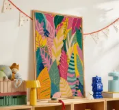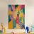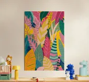 A dense, colorful pattern of overlapping tropical leaves and abstract shapes in bright hues of yellow, pink, blue, and green, creating a joyful, energetic design.