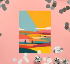 A beautiful landscape of rolling hills and fields, rendered in a colorful patchwork of greens, blues, pinks, and yellows, evoking a sense of idyllic countryside.