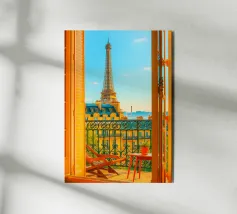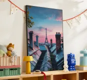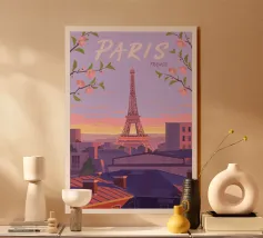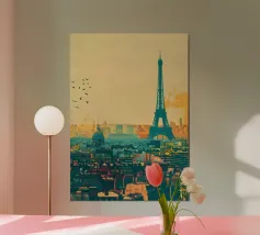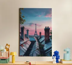 Een serene avond in Parijs met de Eiffeltoren op een achtergrond van levendige zonsondergang. Deze foto legt het iconische monument vast vanuit een uniek dakperspectief, met de charme van Parijse schoorstenen en verweerde daken. De pastelroze en blauwe lucht contrasteert prachtig met de rustieke texturen van de gebouwen en roept een gevoel van rust en romantiek op. De scène nodigt kijkers uit om Parijs vanuit een intiemer en dromeriger perspectief te ervaren en viert de tijdloze allure van de stad van de liefde.
