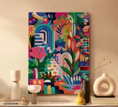 Levendige rode trappen leiden omhoog door een kleurrijk, vereenvoudigd gebouw naar een weelderige, gewelfde ingang, die een reis naar een mooie en exotische bestemming suggereert.