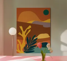 Een abstracte illustratie toont een kleurrijke trap versierd met een verscheidenheid aan potplanten, een mix van architectuur en plantkunde in een levendige, moderne compositie.