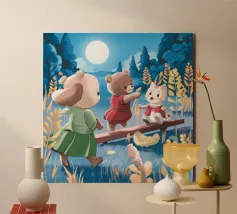 Dit kunstwerk toont een chagrijnige wolk met een gedachtewolkje met daarin een vogel en een beer. Het humoristische en fantasierijke tafereel speelt zich af tegen een zachtblauwe achtergrond.