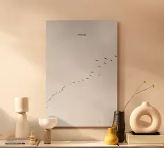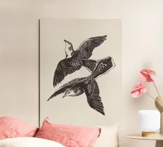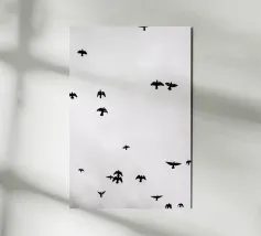 Dit minimalistische ontwerp toont twee zwaluwen die sierlijk door de lucht glijden. De zwart-witte illustratie en de eenvoudige, heldere achtergrond geven het motief een tijdloze en elegante uitstraling. Dit ontwerp is perfect voor liefhebbers van natuurmotieven en minimalistische kunst en brengt rust en lichtheid in elke kamer. Of het nu als muurschildering, kussen of mok is, dit motief is een stijlvol en modern accent voor elk huis en past bij verschillende interieurstijlen.