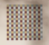 A pattern of alternating colored squares creates a checkerboard effect with shades of beige, gray, and brown. The grid-like design is symmetrical and evenly spaced.