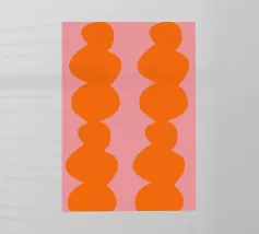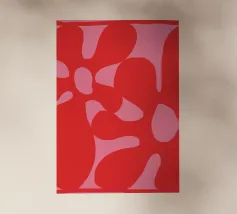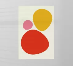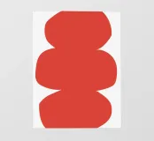 Drie gedurfde rode onregelmatige ovalen vormen zijn verticaal gestapeld. De compositie creëert een opvallend en minimalistisch visueel effect.